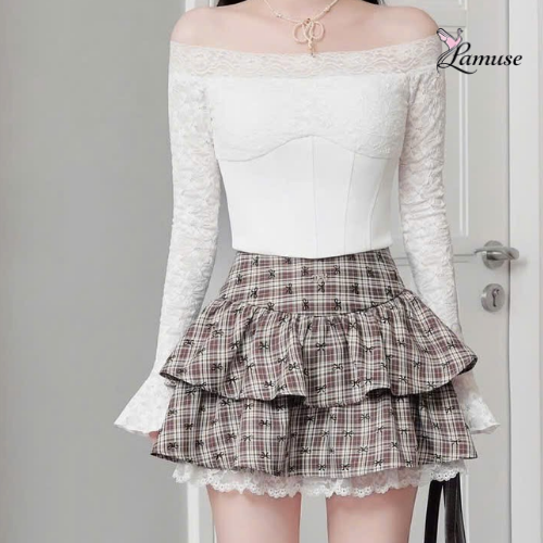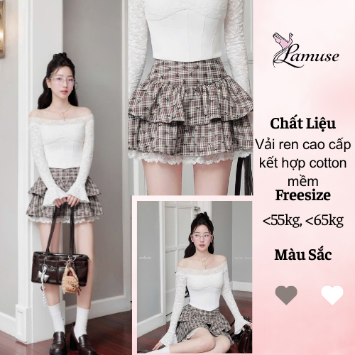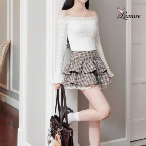 Set Váy Ren Trễ Vai Trắng Chân Váy Caro Nâu Tầng V002 – Lamuse