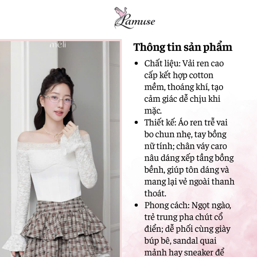 Thiết kế: Áo ren trễ vai bo chun nhẹ, tay bồng nữ tính; chân váy caro nâu dáng xếp tầng bồng bềnh, giúp tôn dáng và mang lại vẻ ngoài thanh thoát.